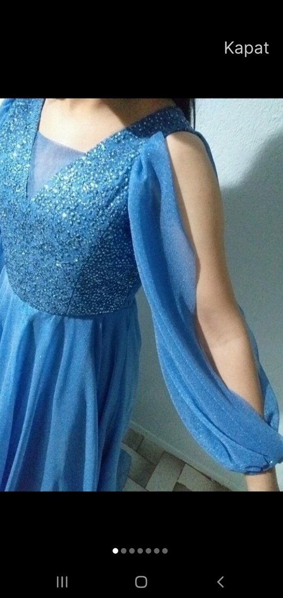 Mavi renkte, V yaka ve kolsuz, drapeli nakış detaylı uzun ve vücuda oturan abiye elbise. Düğünler için uygun.