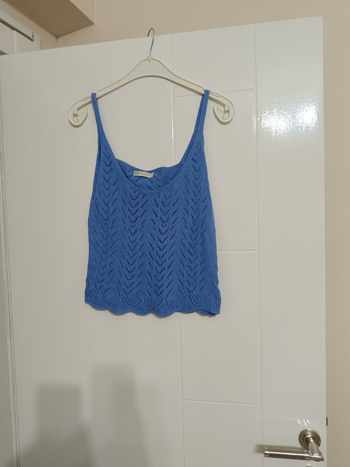 Mavi renkte, V yaka ve kolsuz örgü kadın atlet. Gevşek ve kısa kesimi, pastel tonlarıyla bohem tarzda günlük kullanıma uygun.