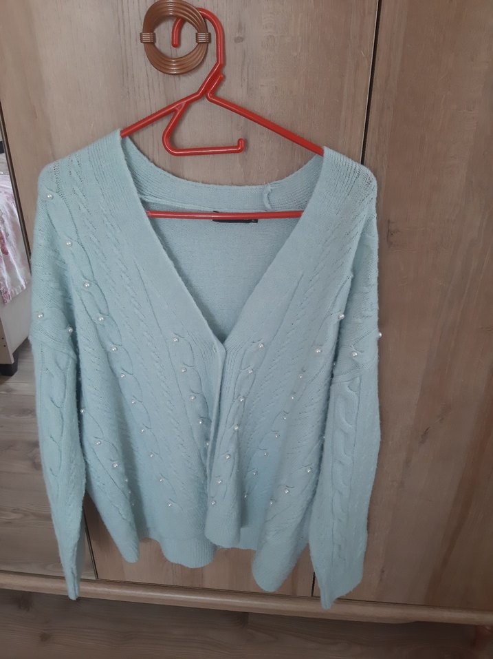 Mavi renkli, V yakalı ve uzun kollu örgü kadın hırka, rahat kesimiyle günlük kullanıma uygun, midi boyda ve pastel tonlarda şık bir parça.