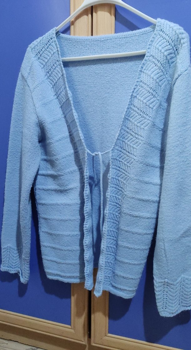 Mavi renkli, V yaka ve uzun kollu örgü kadın hırka. Önden bağlamalı, bohem tarzda, midi boy ve vücuda oturan kesime sahiptir. Rahat ve yumuşak dokulu. Etiketi yok..iki koltuk arası 47 cm omuzdan boy 57 cm kol boyu 56 cm