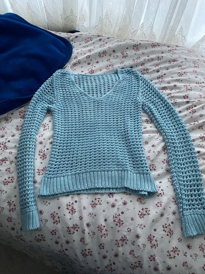 Mavi renkli, V yakalı ve uzun kollu örgü kazak, rahat ve normal boyda kesimiyle günlük kullanıma uygundur.