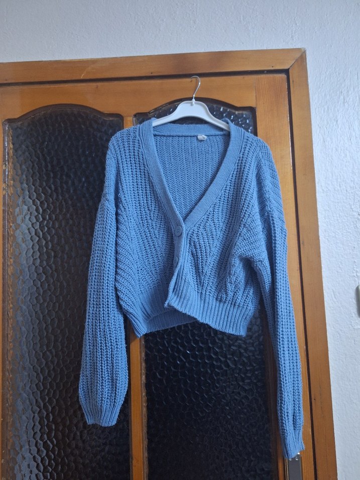 Mavi renkli, örgü dokulu, uzun kollu ve V yaka kadın mini hırka. Salaş kesimi ve desensiz tasarımıyla günlük kullanıma uygundur.