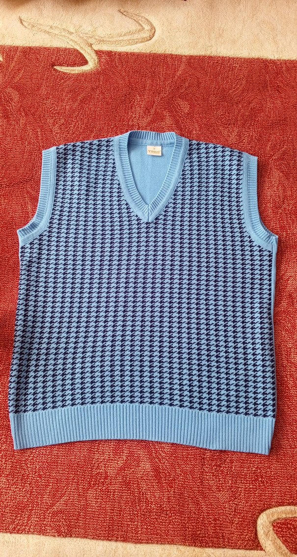 Mavi örgü kumaştan, V yaka ve kolsuz tasarıma sahip erkek kadın süveter. Salaş kesim ve midi boyda, günlük rahat kullanıma uygun. Athleisure ve sokak modasına uyumlu.iki kol arası 56 cm boy 65 cm