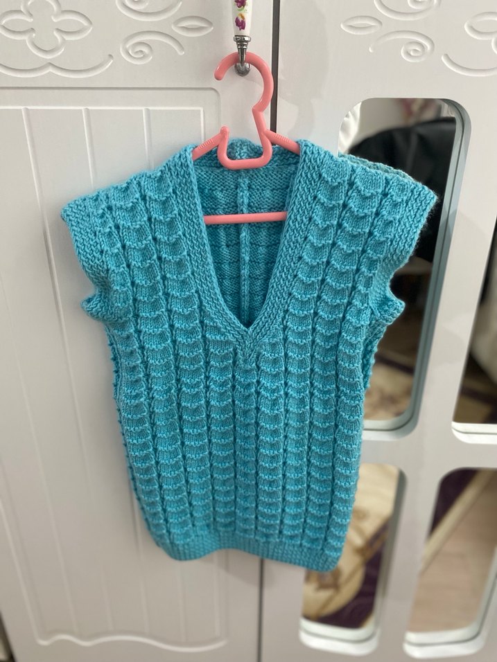 Mavi renkli, V yakalı, örgü örme, kolksuz ve bol kesim süveter. Günlük rahat kullanıma uygundur.