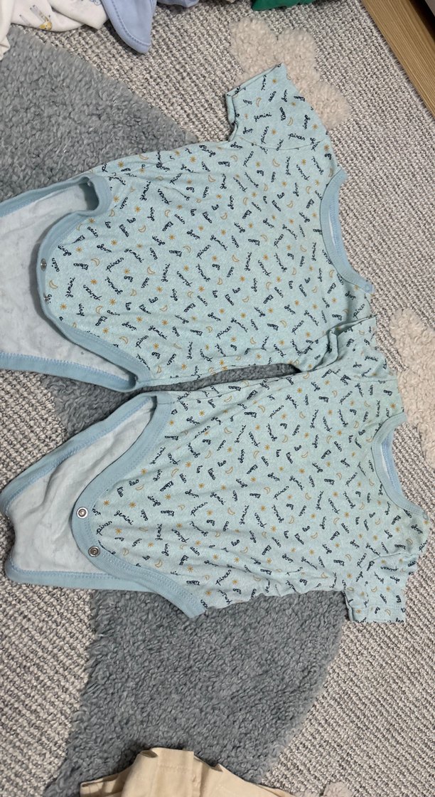 V yaka, örme dokulu, mavi tonlarında kolsuz bebek badisi. Kolay kullanım için çıtçıtlı ve hafif desenlidir.
