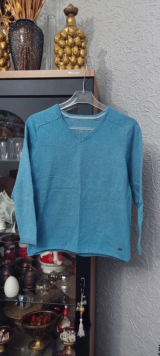 Az kullanılmış temiz S/XS bedene uygun kadın kazak.... Pamuklu, uzun kollu, V yakalı mavi kazak. Salaş kesim ve örme dokusu ile günlük sokak modasına uygun.