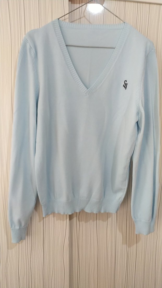 Pastel mavi renkte, V yaka ve uzun kollu kadın kazak. Pamuklu, örme, bol kesim ve normal boydadır, günlük sokak stiline uygundur. kollarında şeritler var
