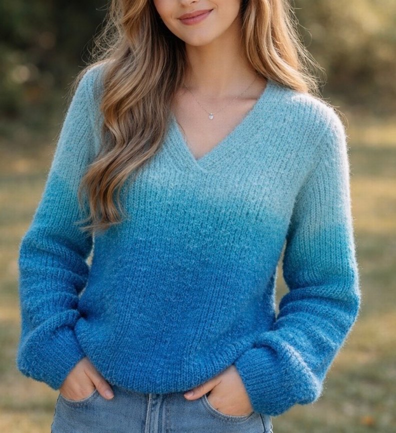 Mavi tonlarında, V yakalı ve uzun kollu örgü kadın kazak. Rahat kesimi ve pastel tie-dye deseniyle günlük kullanıma uygun. Pinterest model xs beden