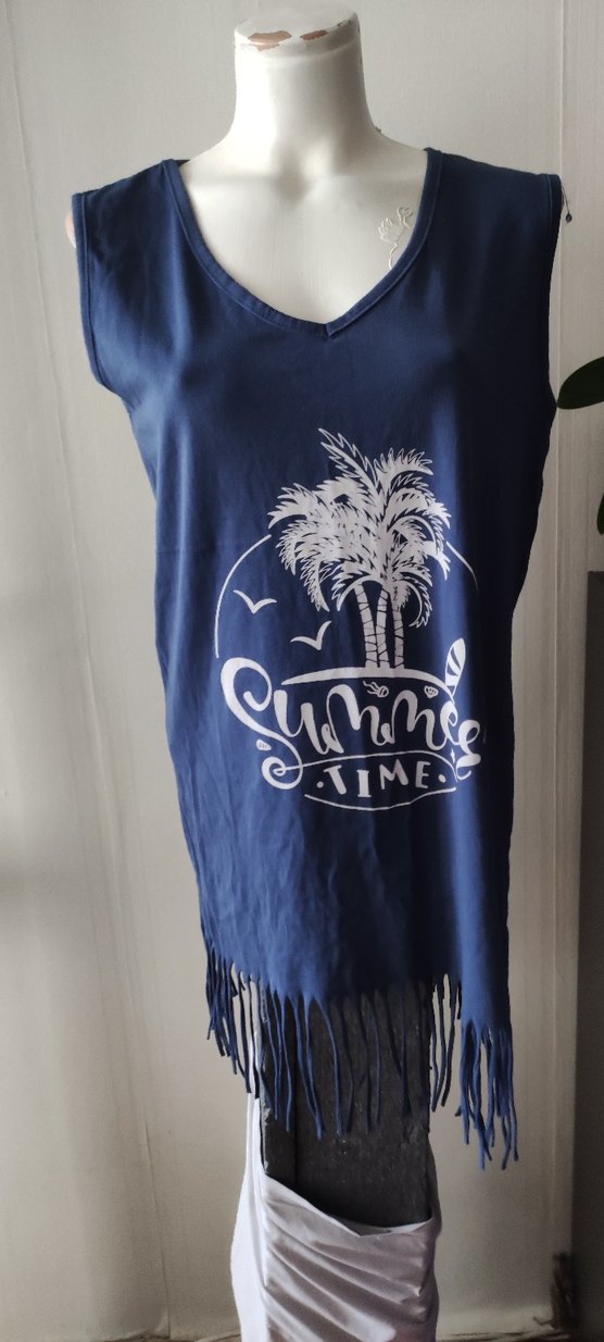 Mavi hamile tişörtü, V yaka ve kısa kolludur. Bol kesim ve parlak baskılı, püsküllü detayları vardır. Sentetik kumaştan, plaj için uygundur.
