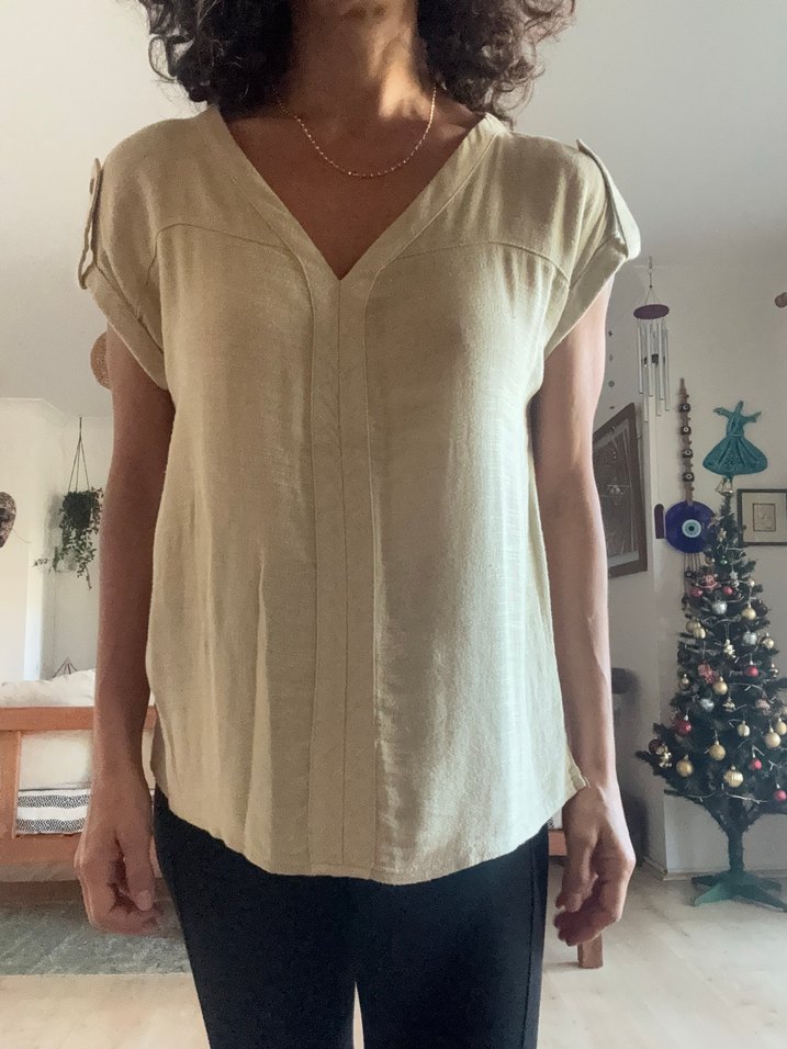 V yakalı ve kısa kollu, salaş kesim bohem tarzda günlük kullanıma uygun hafif bluz.