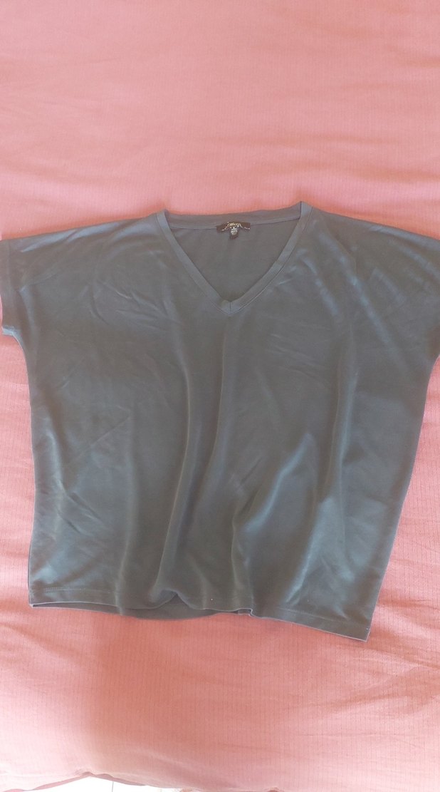 Mavi renkte, V yaka ve kısa kollu oversize tişört. Yumuşak ve ipeksi kumaştan, rahat ve şık bir günlük kullanım sağlar.