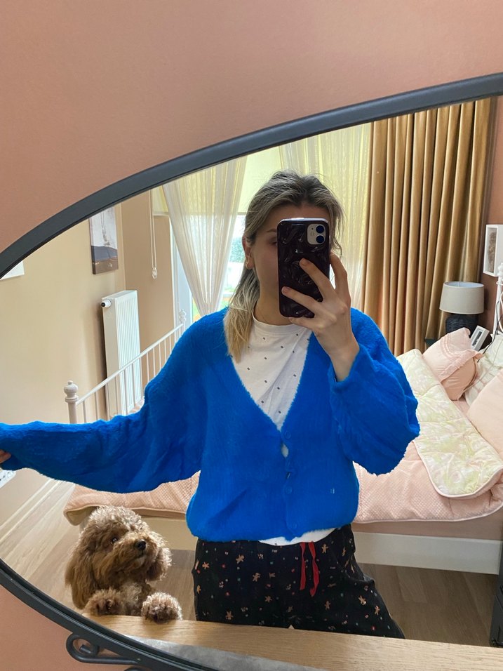 Mavi renkli, V yakalı, uzun kollu, transparan desenli triko kazak, rahat kesimiyle günlük kullanıma uygundur. Yumuşacık defosuz