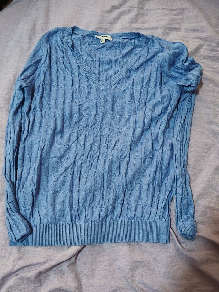 Mavi renkli, triko örgü kadın kazak, V yaka ve uzun kolludur. Yumuşak kumaştan yapılmış, rahat kesim ve normal uzunluktadır. Günlük kullanıma uygundur. koton marka m beden Mavi Omuzdan uca boy 59 iki koltuk altı arası 50 cm m beden koton marka