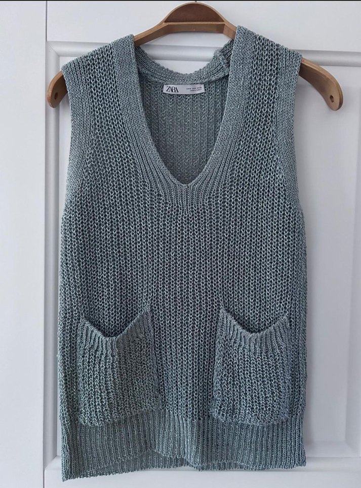 mavi renkte, V yaka ve kolsuz, yumuşak triko kumaştan örülmüş süveter. Normal midi boyda, cepli ve rahat kesimlidir.
