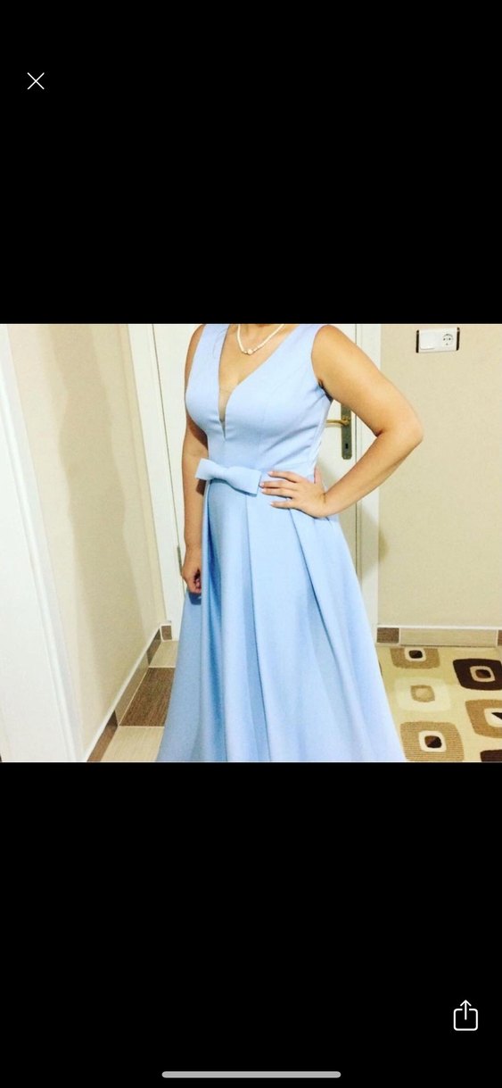 Mavi V Yaka Uzun Abiye Elbise