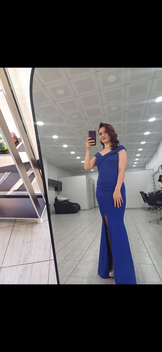 Mavi, V yaka ve yırtmaçlı uzun abiye elbise. Regular kesim ve kolsuz tasarımıyla parlayan kumaş, düğünler için uygun.