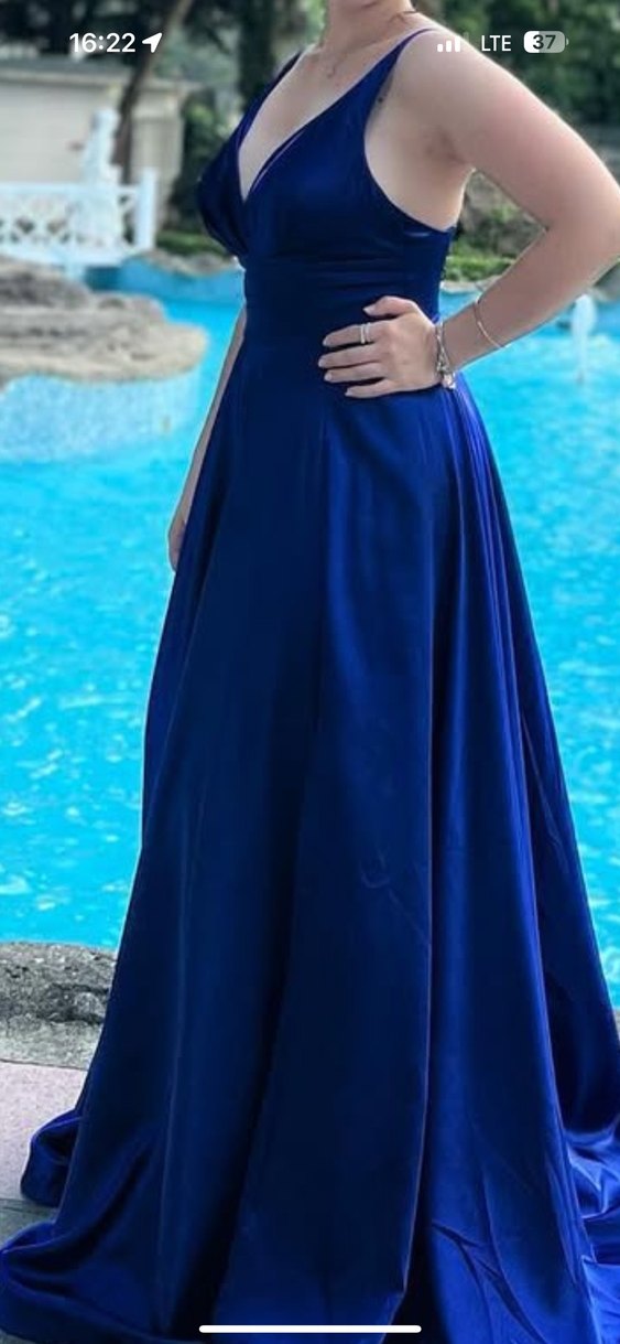 Uzun, parlak mavi renkte, V yakalı, drapeli ve bol kesim. Abiye tertemizdir. İki kez giyilmiştir. Üst beden 38-36 . Alt beden 40. Boyu 170 lere yakın giyilmiştir.