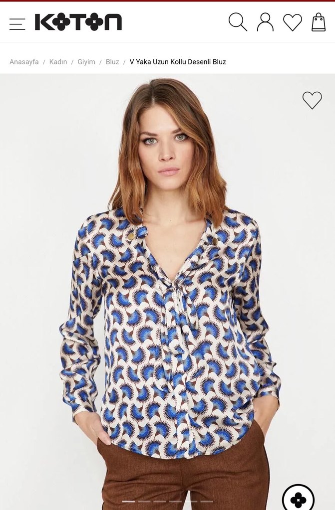 Mavi renkli, V yaka ve düğmeli ön kısmı olan uzun kollu, desenli bluz. Rahat kesimi ve ipeksi dokusuyla günlük kullanıma uygundur.
