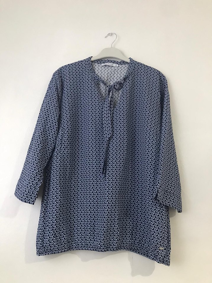 Mavi ve gri tonlarda bağlama desenli, düğmeli, V yakalı, uzun kollu, bol kesim kadın bluz. Yumuşak sentetik kumaştan, günlük kullanıma uygun.