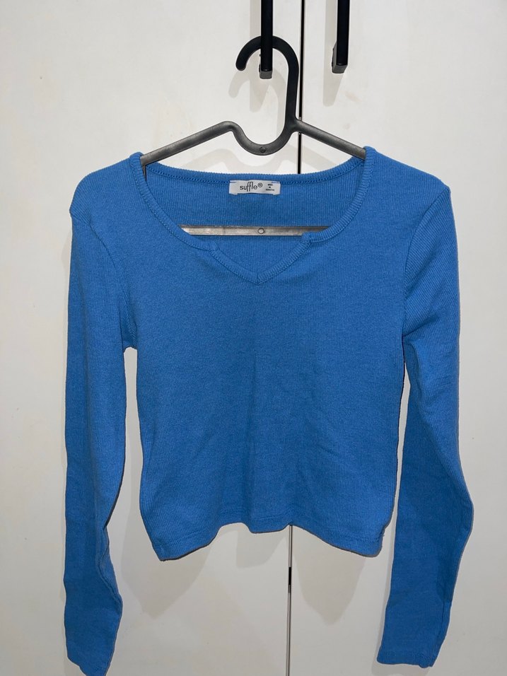 Mavi, yün kumaştan örülmüş, uzun kollu ve V yakalı, vücuda oturan günlük kadın kazak.