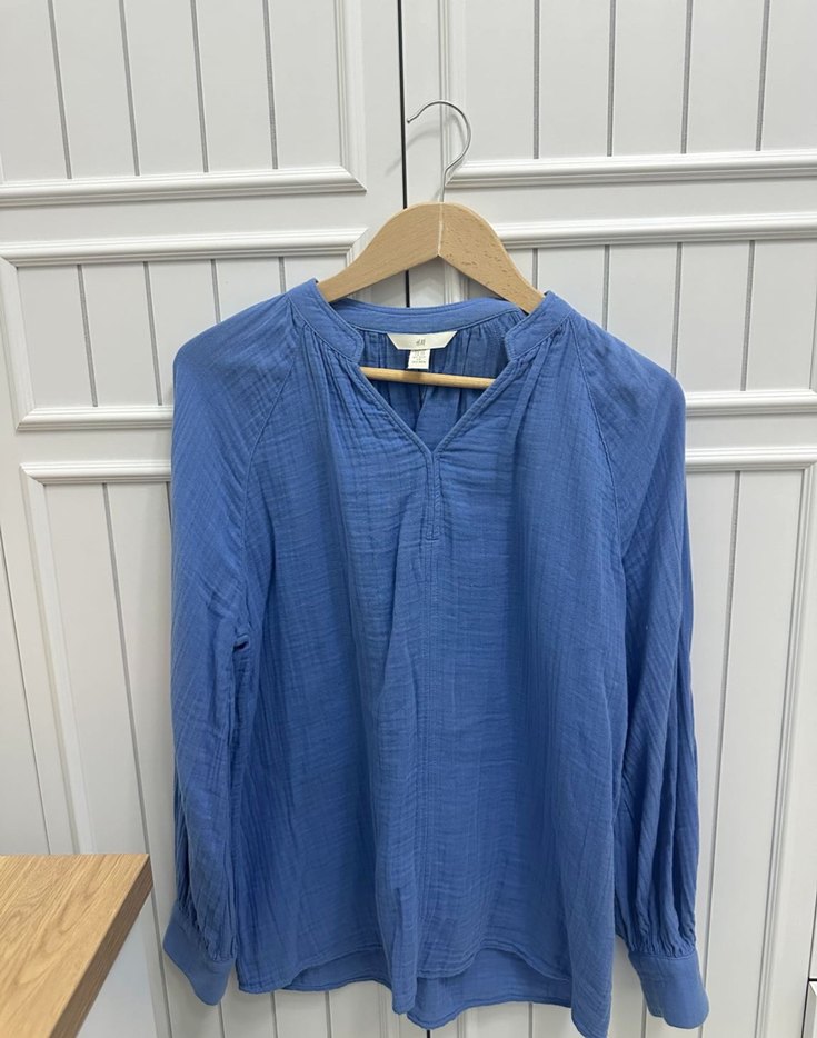 Uzun kollu, V yakalı, bol kesim normalde 38/40 beden giyiyorum oversize mavi keten gömlek. Pileli detayları ve rahat, bağlama desenli bohem tarzıyla öne çıkar.