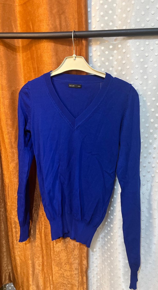 Mavi renkli, V yaka ve uzun kollu, pamuklu triko kumaştan yapılmış dar kesim kadın kazak. Günlük kullanıma uygun rahat ve şık bir sokak stili sunar.