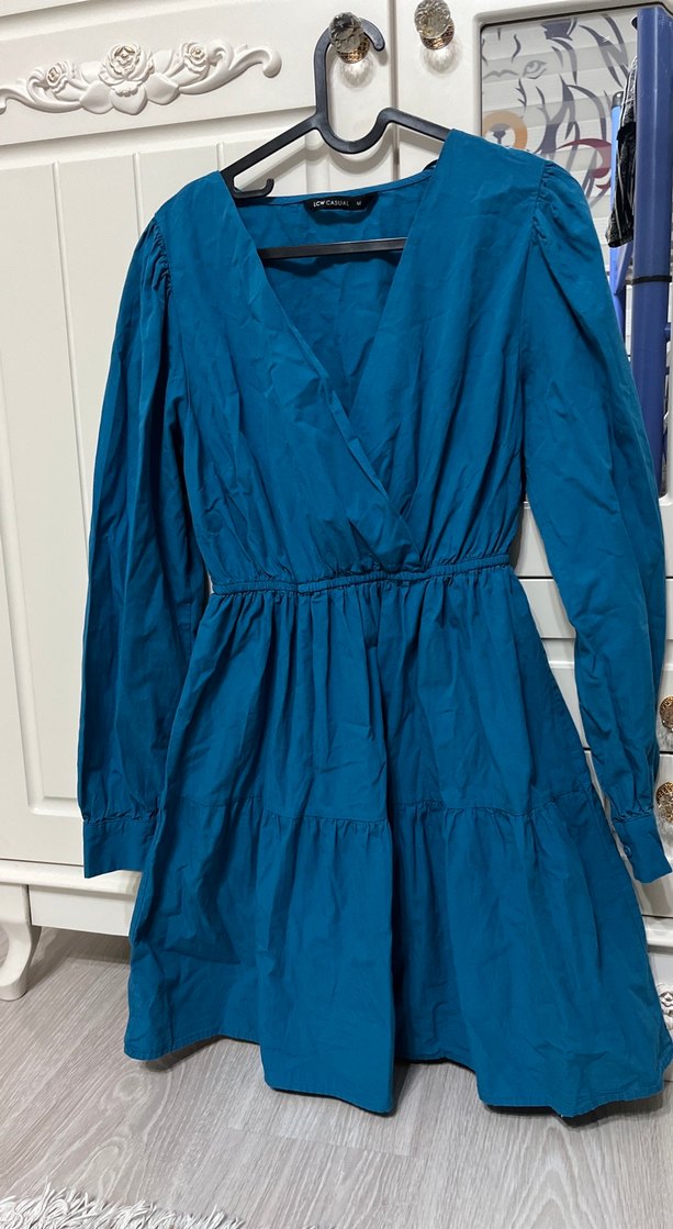 Bu koyu mavi midi elbise, salaş kesim, uzun kollu ve V yakaya sahiptir. Drapeli tasarımı ve sentetik kumaşı ile günlük kullanım için uygundur. 1 kez bile giyinmedim suan bana büyük geliyor o yüzden satıyorum tertemiz rengi de çok hoş