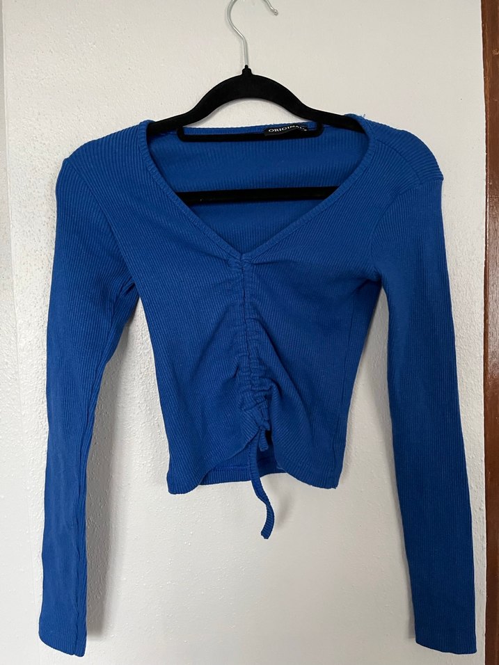 Mavi, V yakalı ve uzun kollu, ön kısmında büzgülü detaylı triko bluz. Yumuşak keten kumaştan, minimalist sokak stili için uygun günlük kullanıma uygundur.