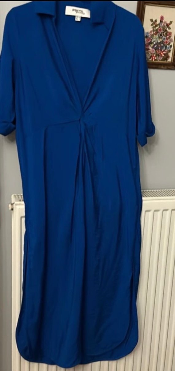 Koyu mavi uzun elbise, V yaka ve kısa kollu drapeli tasarıma sahiptir. Salaş kesimi ve ipeksi dokusuyla bohem tarzı için uygundur.