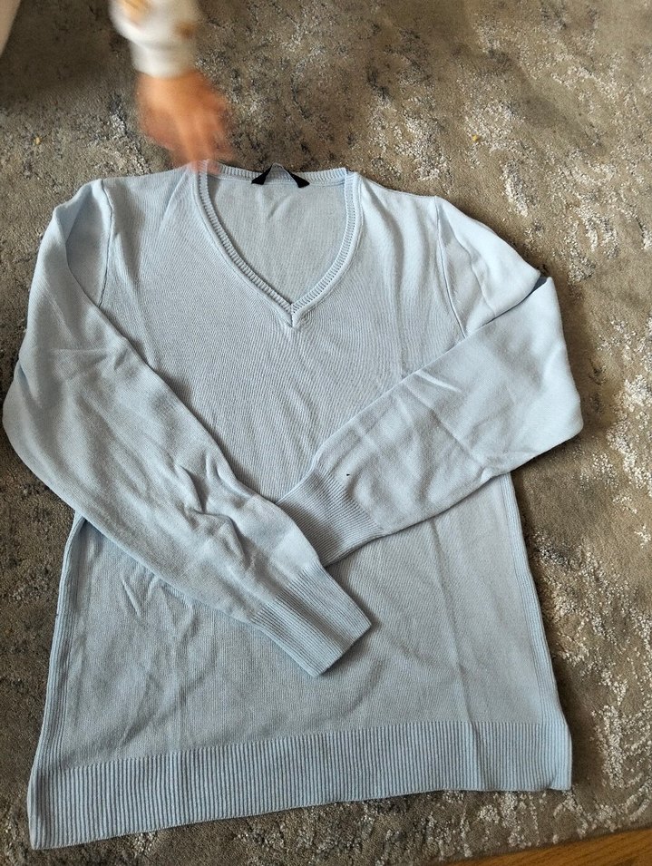 mavi renkte, V-yaka ve uzun kollu kadın yünü triko. Rahat kesimiyle günlük kullanıma uygun, konforlu ve sokak stiline uygun bir parça.