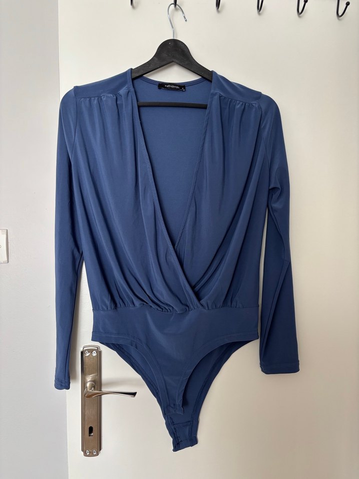 Drapeli V yakalı, uzun kollu mavi kadın bluz, yumuşak sentetik kumaştan, günlük sokak stili için uygun.