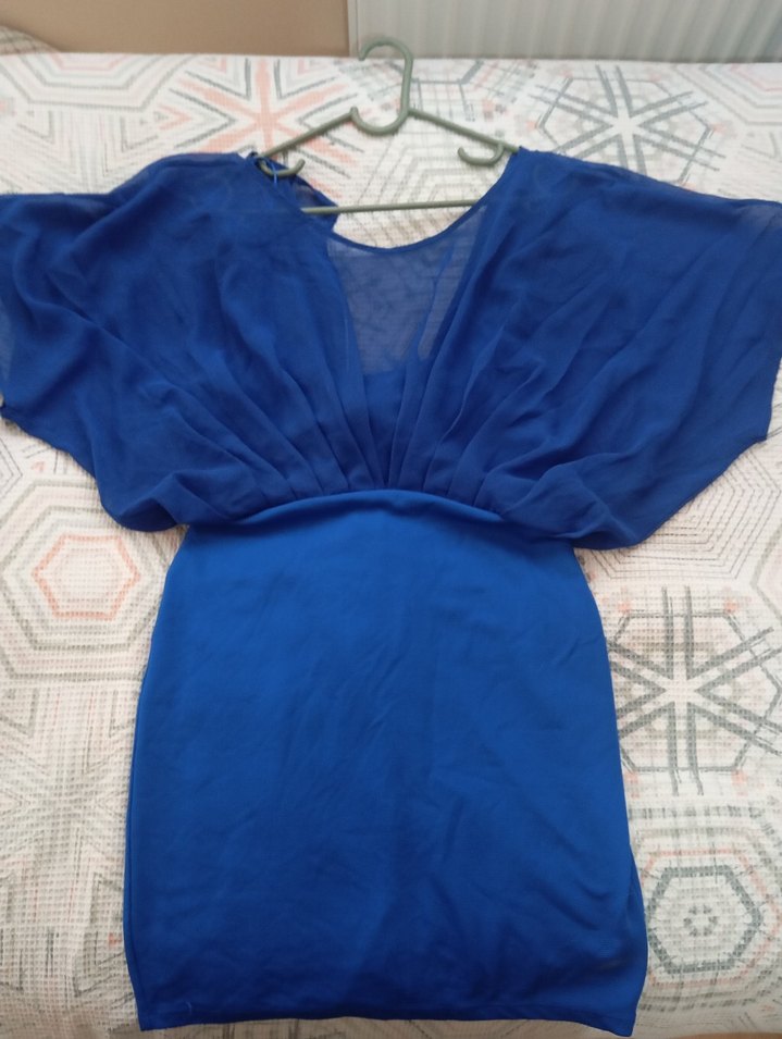 V yakalı, drapeli ve kolsuz mavi abiye elbise, parlak kumaştan ve midi boyda, parti için uygun şık tasarım. 2 kere giyildi arka etek ucunda küçük bi delik var belli olmuyo bile inceleyerek alın iade kabul etmiyorum