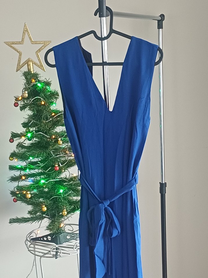 Mavi renkte, V yakalı ve drapeli tasarıma sahip uzun tulum. Kolsuz, vücuda oturan kesim ve pürüzsüz sentetik kumaştan üretilmiştir. Parti için uygundur.