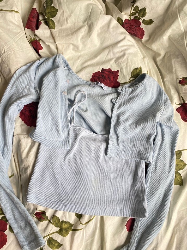 3 lü takım eteğinde varUzun kollu, V yakalı ve düğmeli mavi pastel tonlarda hamile gömleği. Yumuşak keten kumaştan, rahat ve şık sokak stili için uygundur.