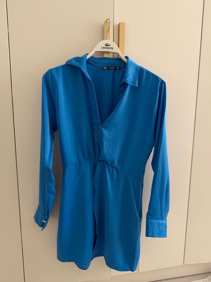 Mavi parlak renkte, V yakalı ve düğmeli detaylı uzun kollu elbise. Rahat kesimi ve kısa boyu günlük kullanıma uygundur.