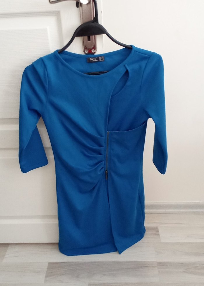 V yakalı, fermuarlı ve uzun kollu mavi yırtmaçlı parlak sentetik kumaştan midi boydadır. Günlük sokak modasına uygundur.