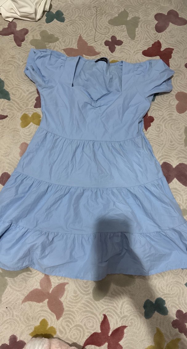 Pastel mavi midi boy, V yakalı, kısa kollu ve vücuda oturan bu elbise, fırfır detaylarına sahip olup, rahat sentetik kumaştan üretilmiştir.