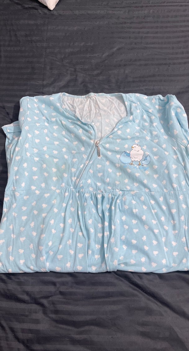 Pastel mavi renkli, kısa kollu, V yakalı hamile ve emzirme gecelik. Midi boy, bol kesim ve önünde emzirme için fermuar ve küçük kuş desenli.