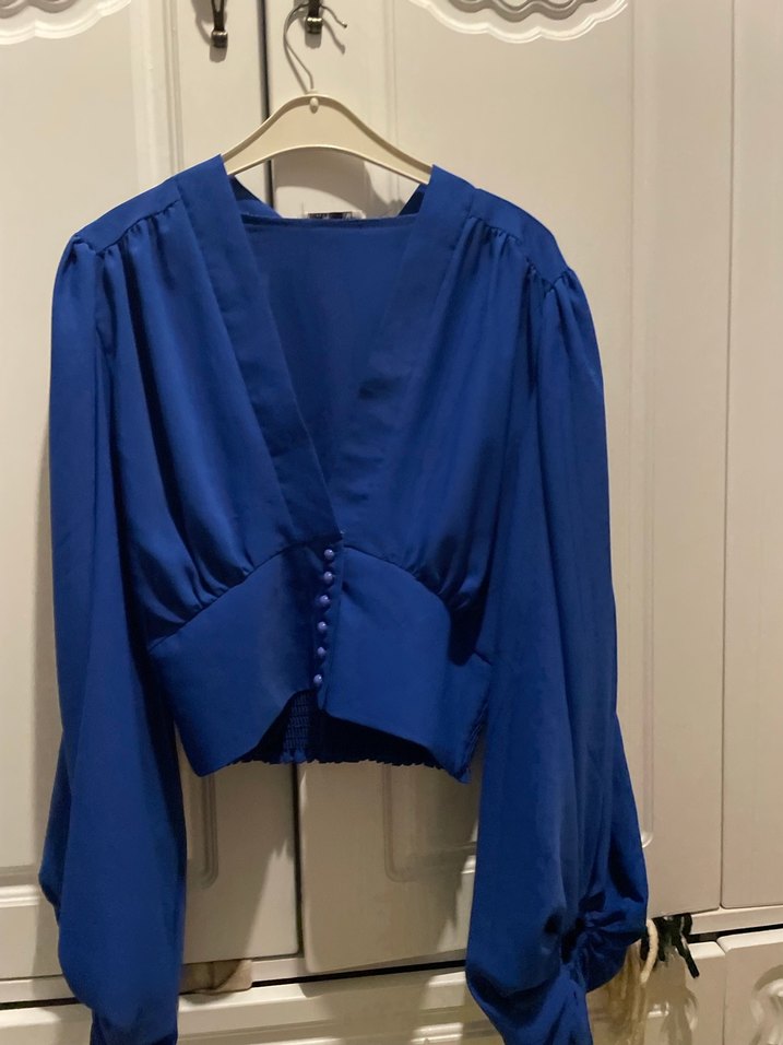 Parlak mavi renkte, V yakalı ve uzun kollu kadın bluz. Düğmeli ön kısmı ve bol kesimiyle ipeksi dokuda, ofis için uygundur. Defosu yoktur