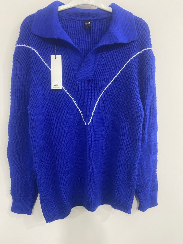 Uzun kollu, V yakalı mavi kadın triko kazak. Bol kesim ve midi boyuyla rahat ve renkli günlük kullanıma uygundur.