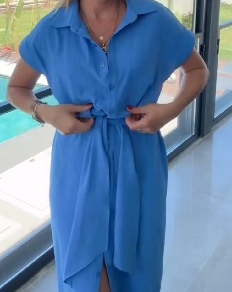Mavi uzun elbise, V yaka ve kısa kollu, bol kesimdir. Kemerli ve sentetik kumaştan yapılmıştır, günlük rahat stil için uygundur.