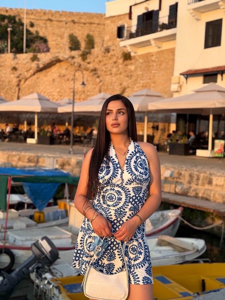 V yakalı, kolsuz, mavi tie-dye desenli, drapeli, bohem tarzda kısa ve vücuda oturan elbise.