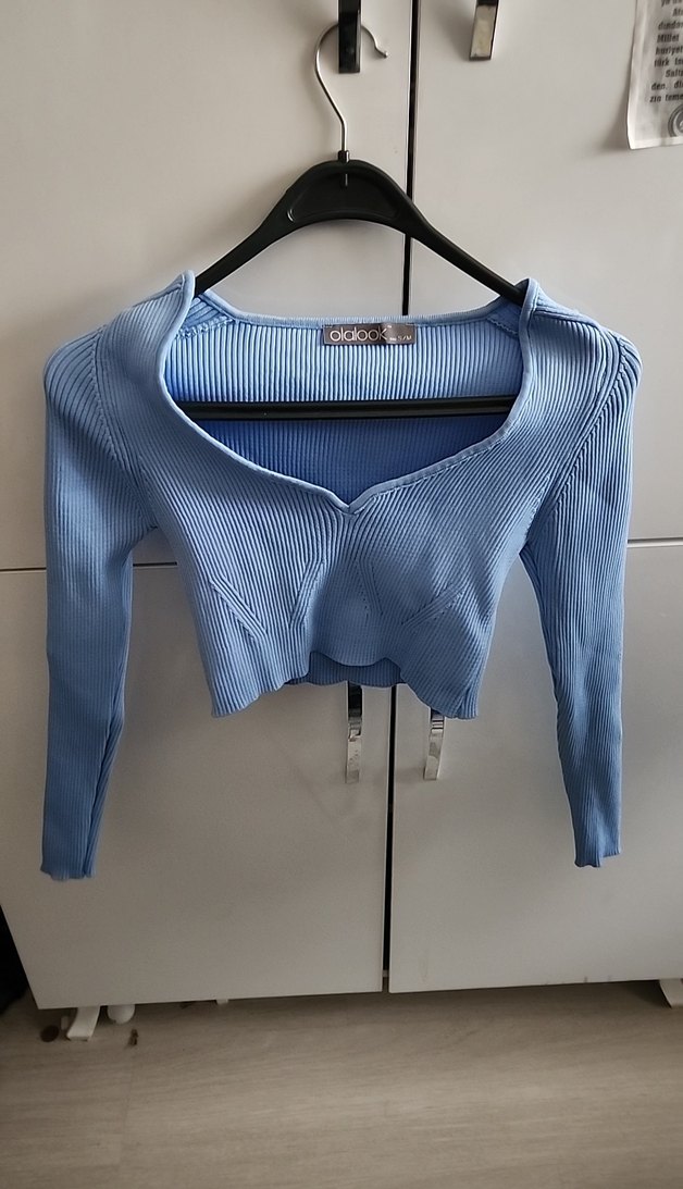 Uzun kollu, V yakalı, kısa kesim ve pastel mavi renkte, yumuşak dokulu triko kumaştan üretilmiş, kadınlar için dar kesim kazak. Günlük sokak stiline uygun.