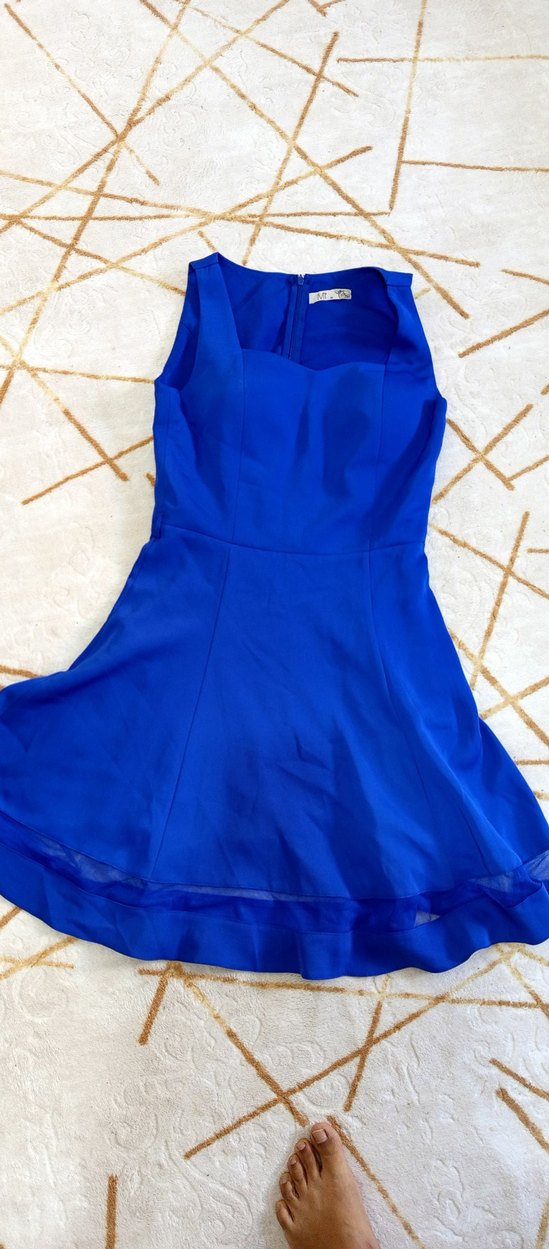 Parlak mavi renkte, V yakalı ve kolsuz, oturan kesim midi abiye elbise. Etek kısmında fırfır detayı bulunur, parti için uygundur.