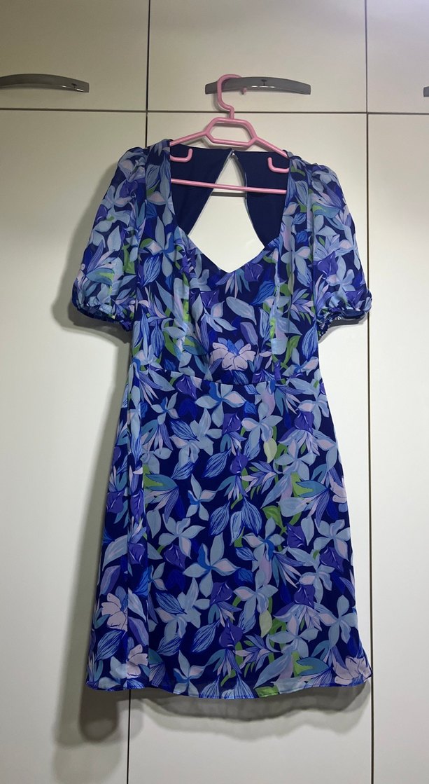 V yakalı, kısa kollu ve drapeli kesime sahip mavi tie-dye midi elbise. Bohem tarzıyla romantik akşamlar için uygun.