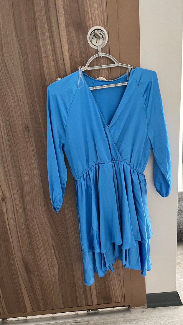 Parlak mavi saten kumaştan, uzun kollu, dökümlü V yakalı bol kesim midi elbise. Minimalist bohem tarz