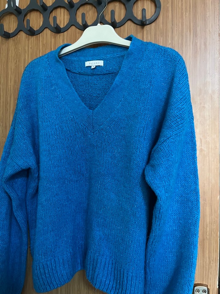 Mavi renkli, V yaka ve uzun kollu, bol kesim örgü kazak, rahat ve normcore tarzıyla günlük kullanıma uygun.
