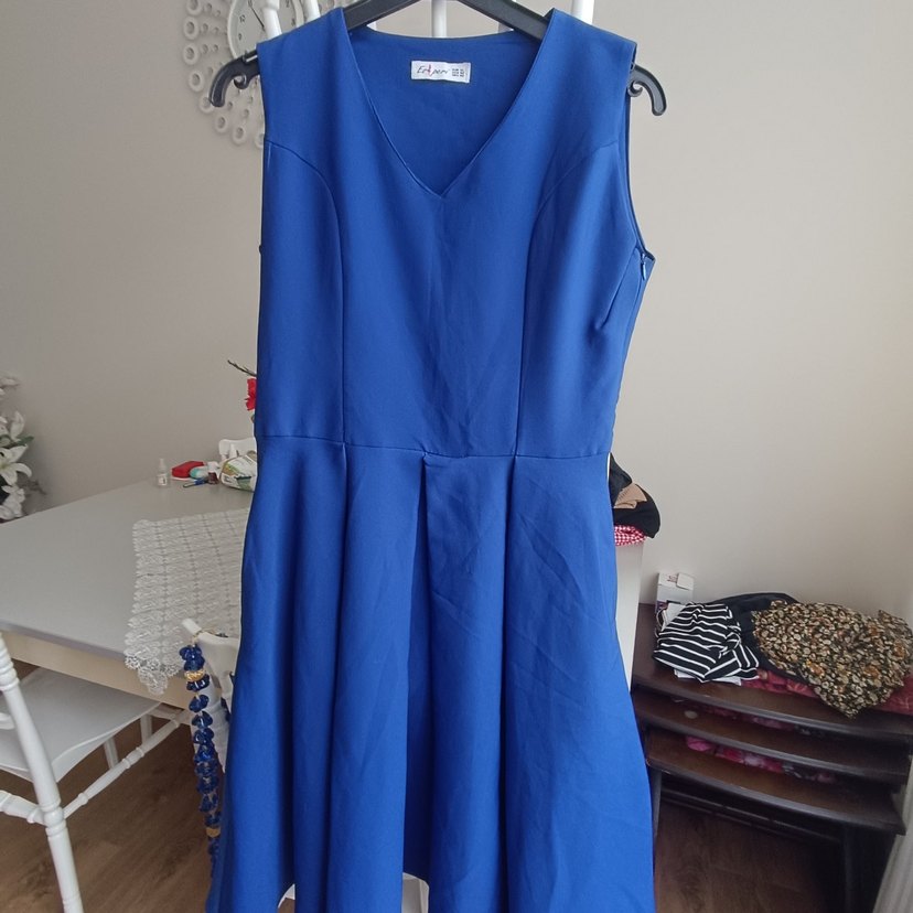Parlak mavi renkte, V yakalı ve kolsuz piliseli midi elbise. Gevşek kesimi ve Paris sokak modası tarzıyla gündelik kullanıma uygundur. ✨40 beden ve 42 bedene uygundur