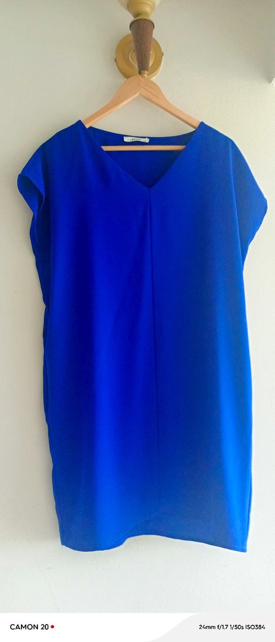 Mavi renkte, V yakalı ve salaş kesimli hamile tunik. Dökümlü tasarım, kısa kollu ve midi boyda. Günlük kullanıma uygun.