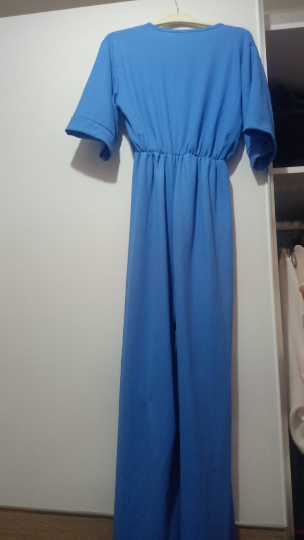 Mavi renkli, salaş kesimli, drapeli kısa kollu tulum. V yakalı, yumuşak sentetik kumaştan, günlük sokak stili için uygun, minimal ve bohem tarzda.